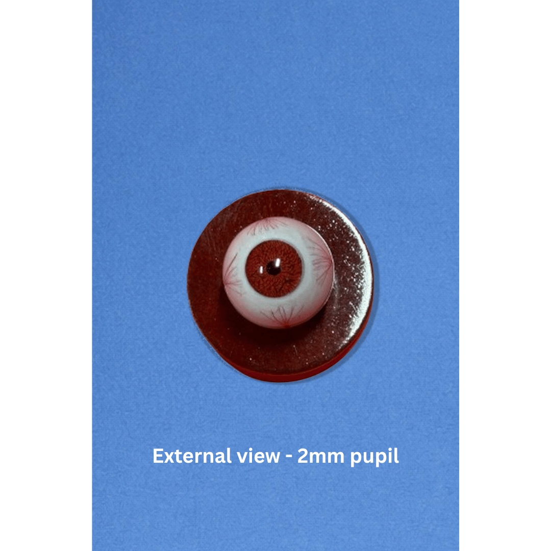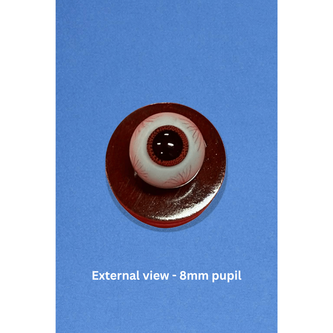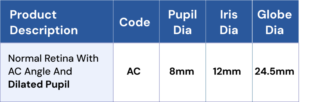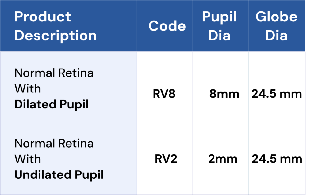 - These Model eye consists of an acrylic eye with either 8mm or 2mm pupil and normal retinal design. The globe is filled up with fluid so as to resemble vitreous filled posterior chamber.